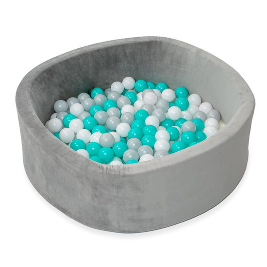 Grey Velvet Ball Pit with 200 Aqua, White, & Grey Balls